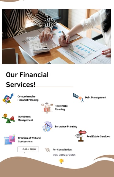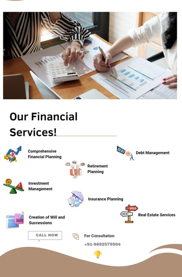 Our team assists individuals and organisations in managing their finances and attaining their financial objectives. Our financial guides use their knowledge in finance, markets, and investment to help clients understand their present financial condition, establish and prioritize their goals, and design a bespoke financial strategy to reach those goals. We conduct in-depth studies of our customers' income, expenses, assets, liabilities, and risk tolerance in order to develop customized financial plans that match their specific needs and targets. We provide a wide range of services.